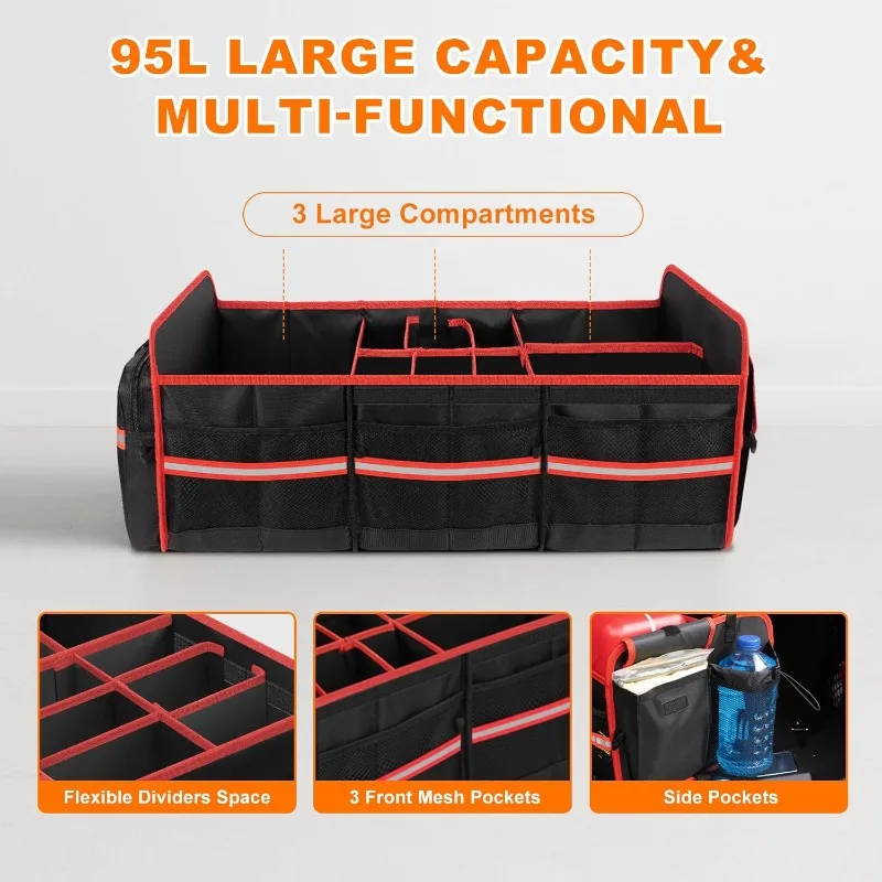 capacity of 95L, allowing you to store various items such as groceries, gear, daily essentials, food, and more. It is suitable for picnics, travel, shopping outings, and daily use. Keep your car organized and your items easily accessible
