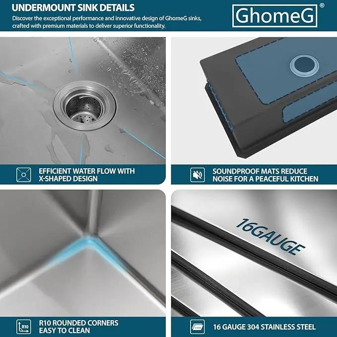 • Practical Features: The R10 radius rounded corners allow for easy wiping and cleaning. This sink also features an anti-condensation coating to prevent moisture buildup, while thick silicone pads minimize noise during use. Rear offset drain, X-shape water line on sloped bottom promotes fast drainage and keeps the stainless undermount kitchen sink dry and clean.