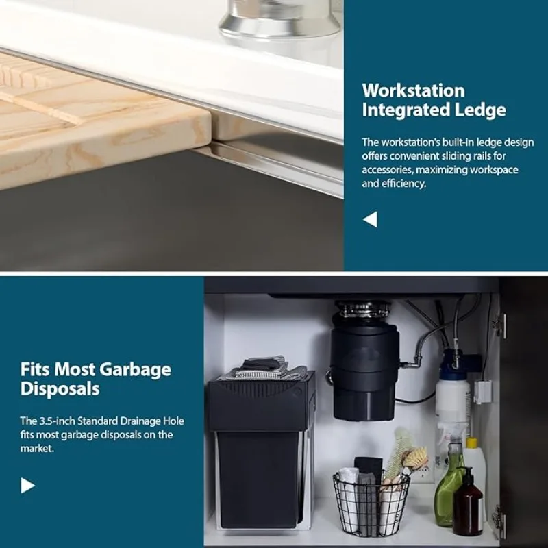 • All-in-One Workstation Kitchen Sink: This spacious single-bowl sink is designed for uninterrupted cleaning, easily accommodating large items such as buckets, basins, and pots. Overhanging ledge on the front and back act as a track, converting the undermount sink into a convenient workstation. The included roll-up drying rack is ideal for drying dishes or cooling hot pots, while the T304 stainless steel bottom grid protects the sink from scratches. The efficient basket strainer filters out debris, and the cutting board is perfect for chopping vegetables, with the colander facilitating easy moisture drainage.