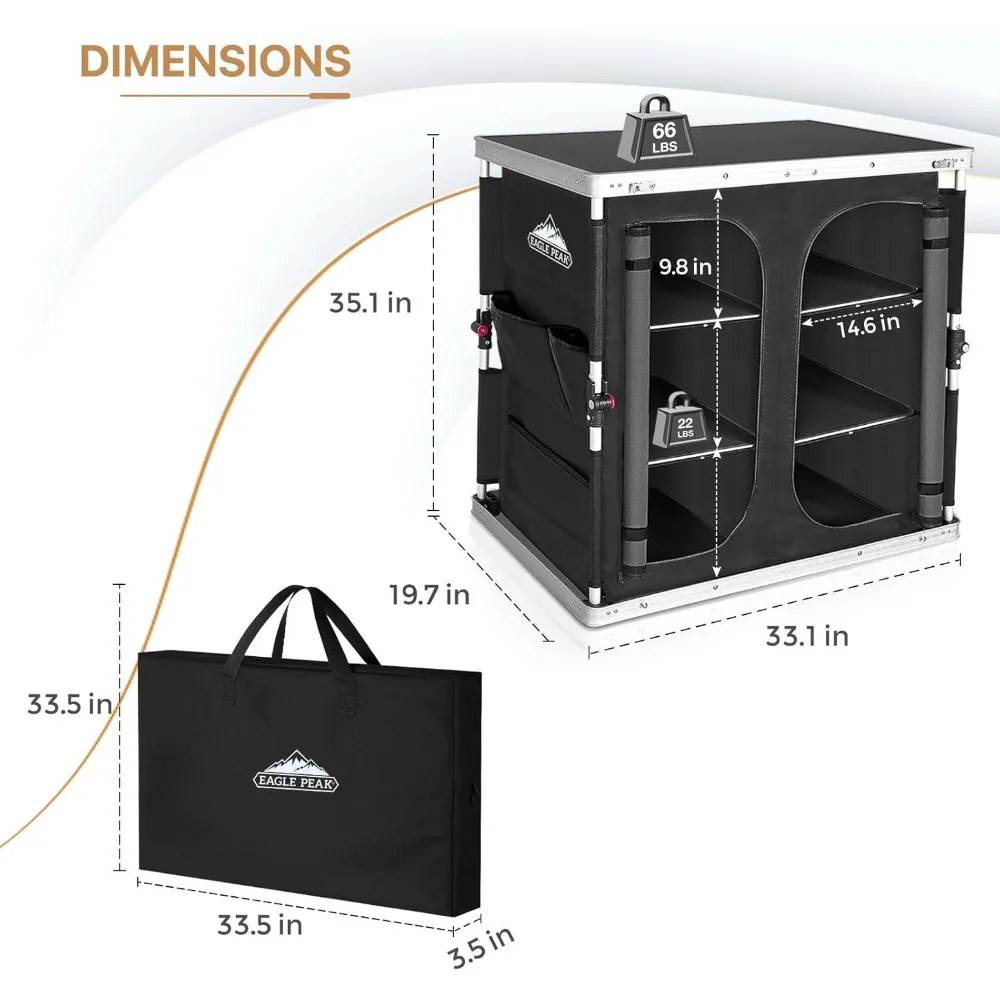 EXCELLENT QUALITY: EAGLE PEAK camping kitchen table is made of durable MDF tabletop, waterproof and stain resistant material, and is easy to clean. The frame is made of anti-rust powder-coated aluminum pipe and polyester 600D with PVC coating. The aluminum alloy bracket with corner leg support system ensures the strong stability for long lasting use. This table supports up to 66 lbs.