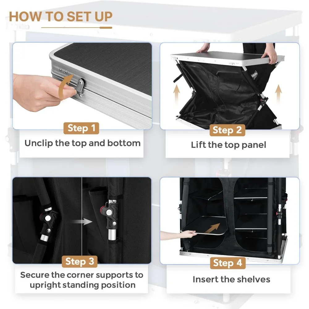 BREATHABLE & EASY TO CLEAN: EAGLE PEAK portable camping table’s waterproof desktop and the 3 level shelves can be conveniently removed to clean when dirty. 4 mesh backside windows provide breathable airflow. NOTE:the table should not be used in the rain.