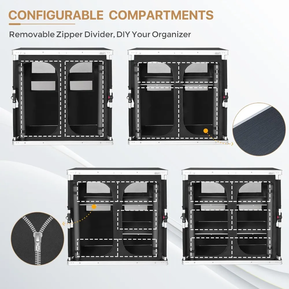 Double Outdoor Folding Camping Table with Large 3-Tier Storage Organizer and Side Pockets, Easy Set Up Portable Aluminum Camping Kitchen, Black