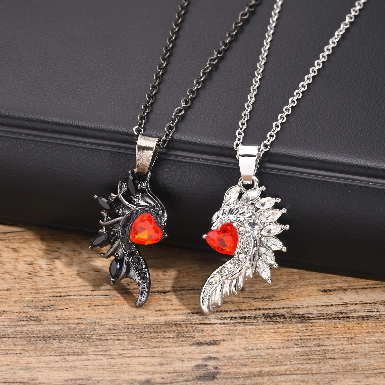 Mprainbow Angel Devil Wings Couple Pendant with Red Heart Stone,Black and White Simple Valentine's Day Gift Necklace Set