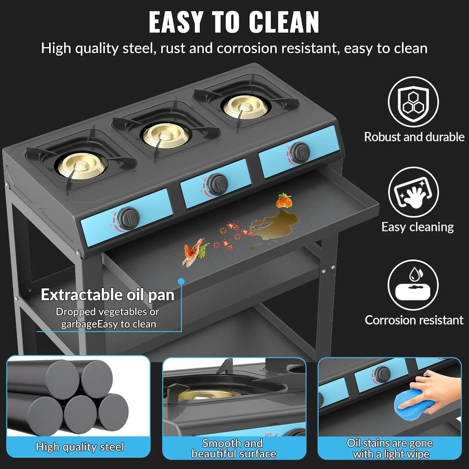 【Widely Application】-Perfect for Outdoor Kitchens and Weather Condition,rain or Shine,especially for Outdoor Kitchen and BBQ Island. This 3 burner gas stove has a detachable stand, portable and easy to carry , making it the ideal choice for any outdoor cooking experience with family and friends.