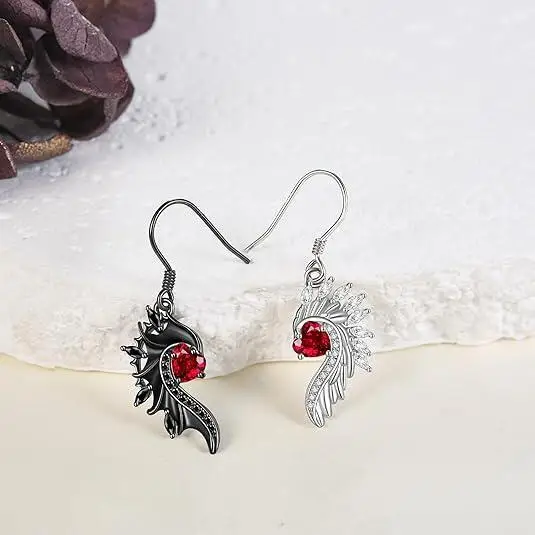 Punk Angel And Demon Wing Asymmetric Personality Earrings For Women Black White Simple Valentine's Day Gift Necklace Set