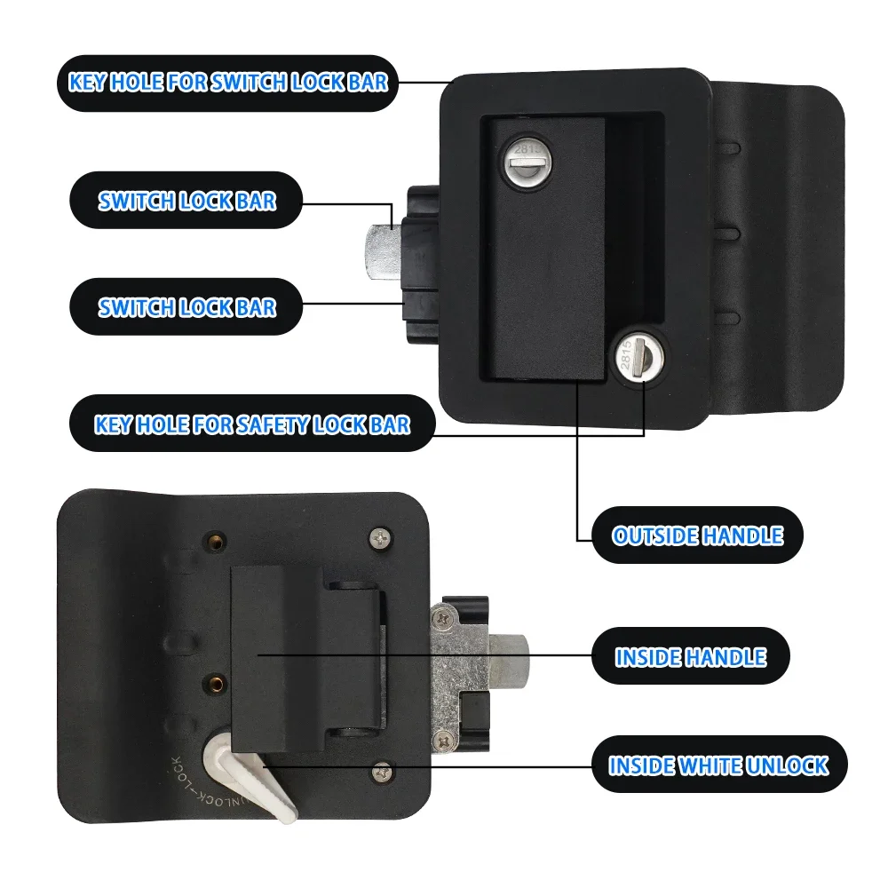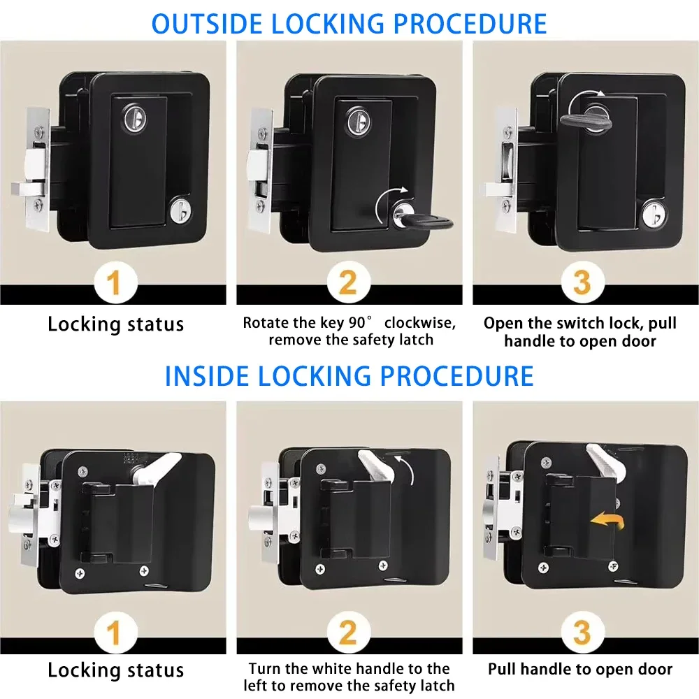 SAFE & PROTECTIVE: With a built-in deadbolt and the function of back locking, this trailer door latch is much safer than a normal lock. Inside and outside double open, mute design and smooth switch, not card lock, better protecting your property safety.