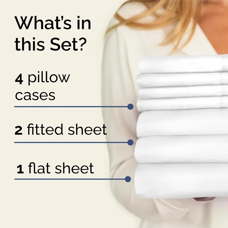 7 PIECE BED SHEET SET: 4 pillow cases, 1 flat sheet, and 2 fitted sheets. Flat sheet (102″x 108″) Fitted sheet (39″x 80″) 4 pillow cases (20″x 40″) - A comfy upgrade for everyone—where comfort meets elegance.